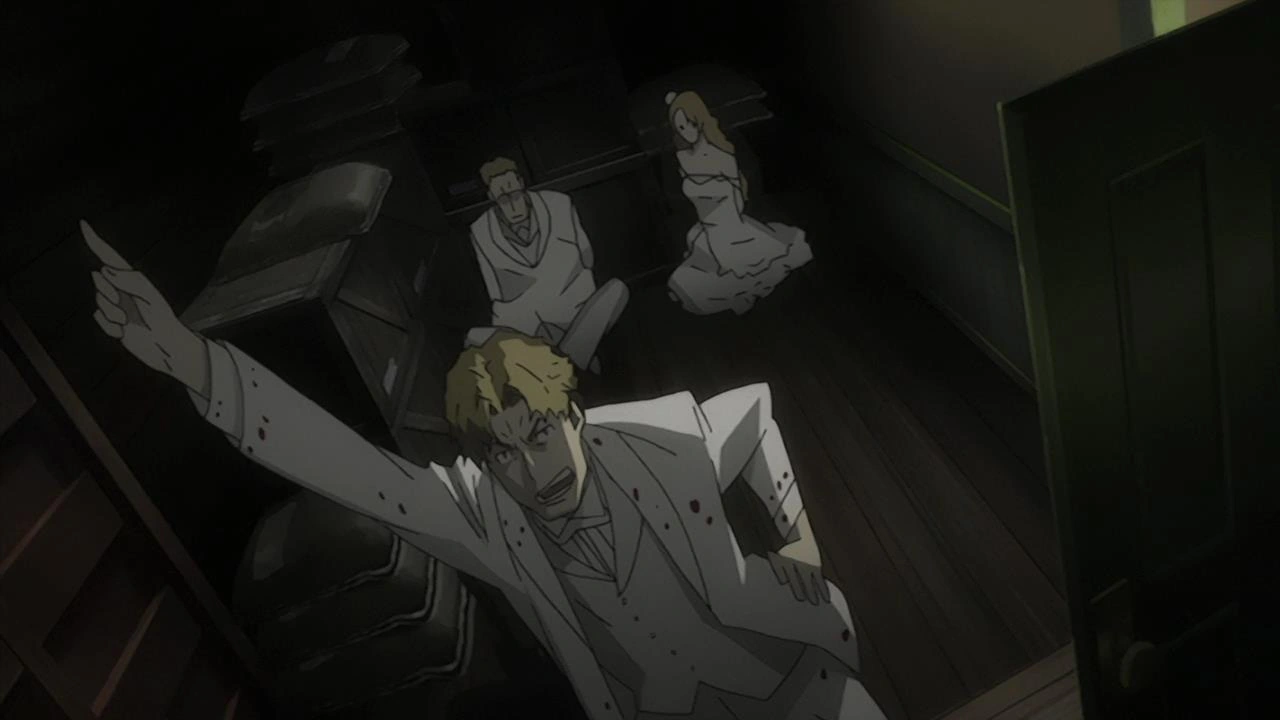 Inside the storage closet, Mary becomes frightened at the sound of footsteps from the corridor outside. She accidentally knocks a broom down, drawing the attention of the White Suit about to leave the car. He returns and discovers Mary in the closet. Covering her mouth, he grins while she squirms and rants that unlike Ladd (the White Suit's leader), he prefers to hurt people who are weaker than him. The man abruptly collapses, blood pooling from his back, and Mary looks up to see Chané Laforet in the corridor with a bloody knife in hand. Mary screams.