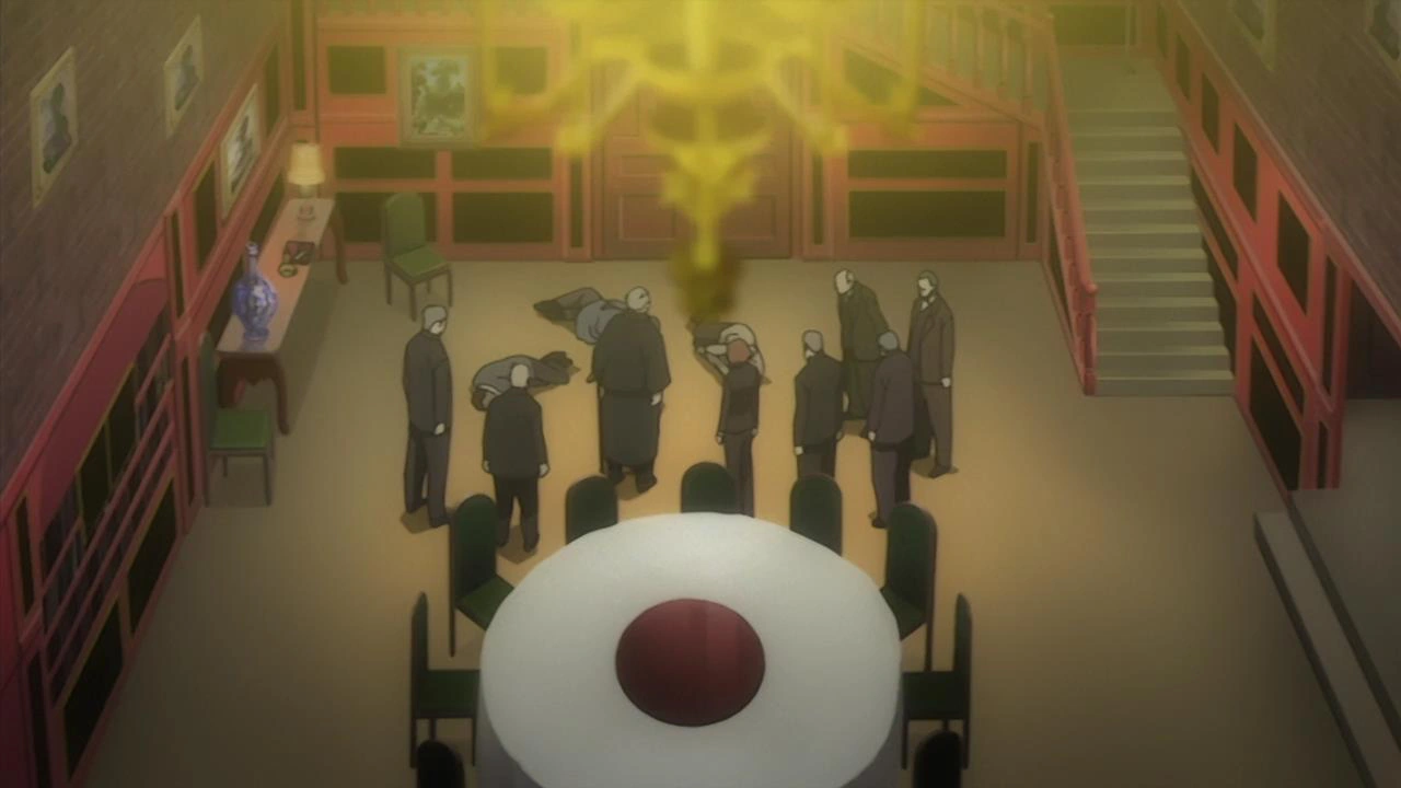 In 1930, Szilard Quates stands over the bodies of Dallas Genoard and his three companions, all of whom lie unconscious on the floor of Szilard's secret meeting room. Dissatisfied, Szilard pokes Dallas' head with the end of his cane and grumbles that he doubts he will gain much knowledge from 'eating' Dallas. He acknowledges that he "brought this on himself" and calls Ennis' name. Ennis fills a syringe with liquid from a beaker, and injects the liquid into Dallas' arm.