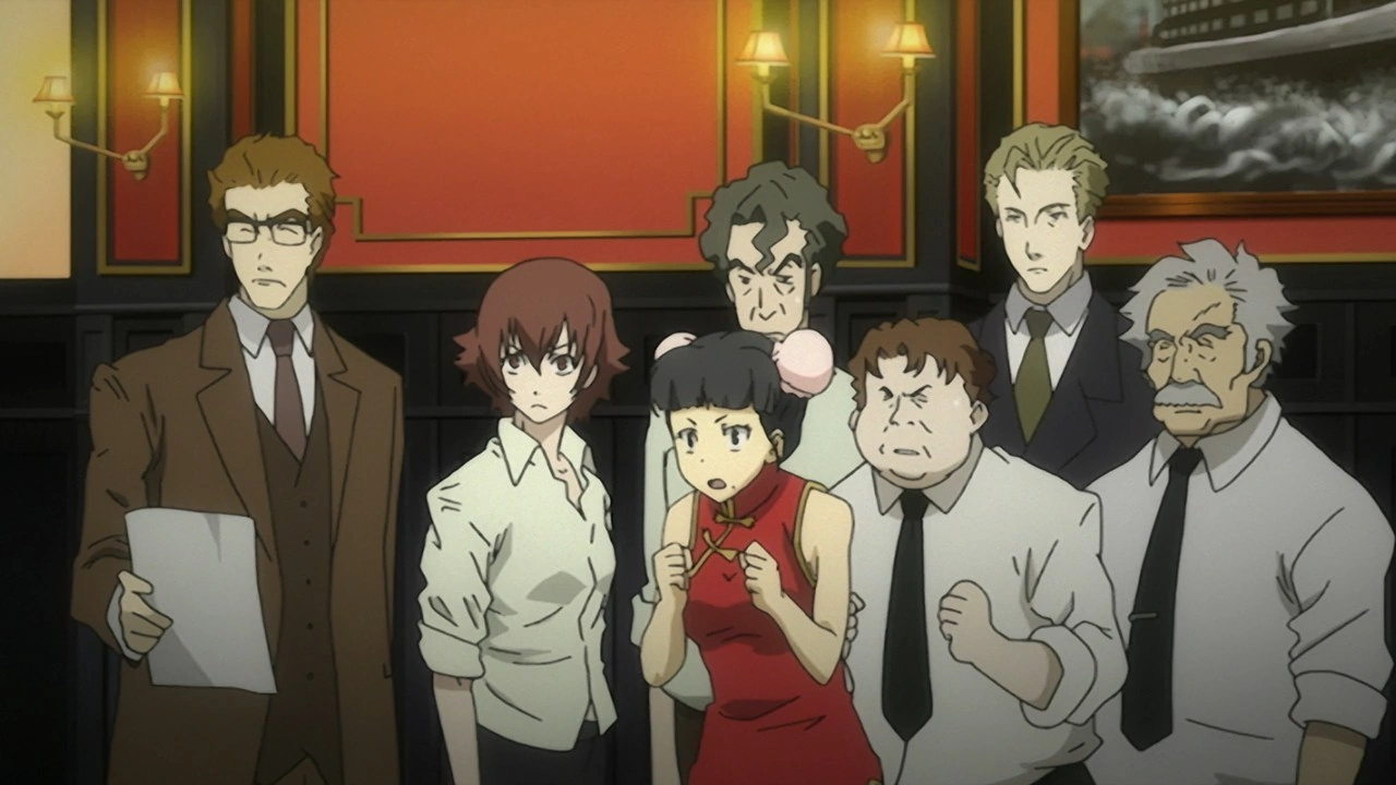 The dominos scene in the anime corresponds with the beginning of 1932 Drug & The Dominos' third chapter. The scene takes place on January 2, 1932, and takes place near the speakeasy's bar—Maiza is supposed to be sitting at the counter when he remarks on the game being popular with children. Ronny sets up his dominos abnormally fast in the novel, but in the anime sets up his dominos with painstaking care.