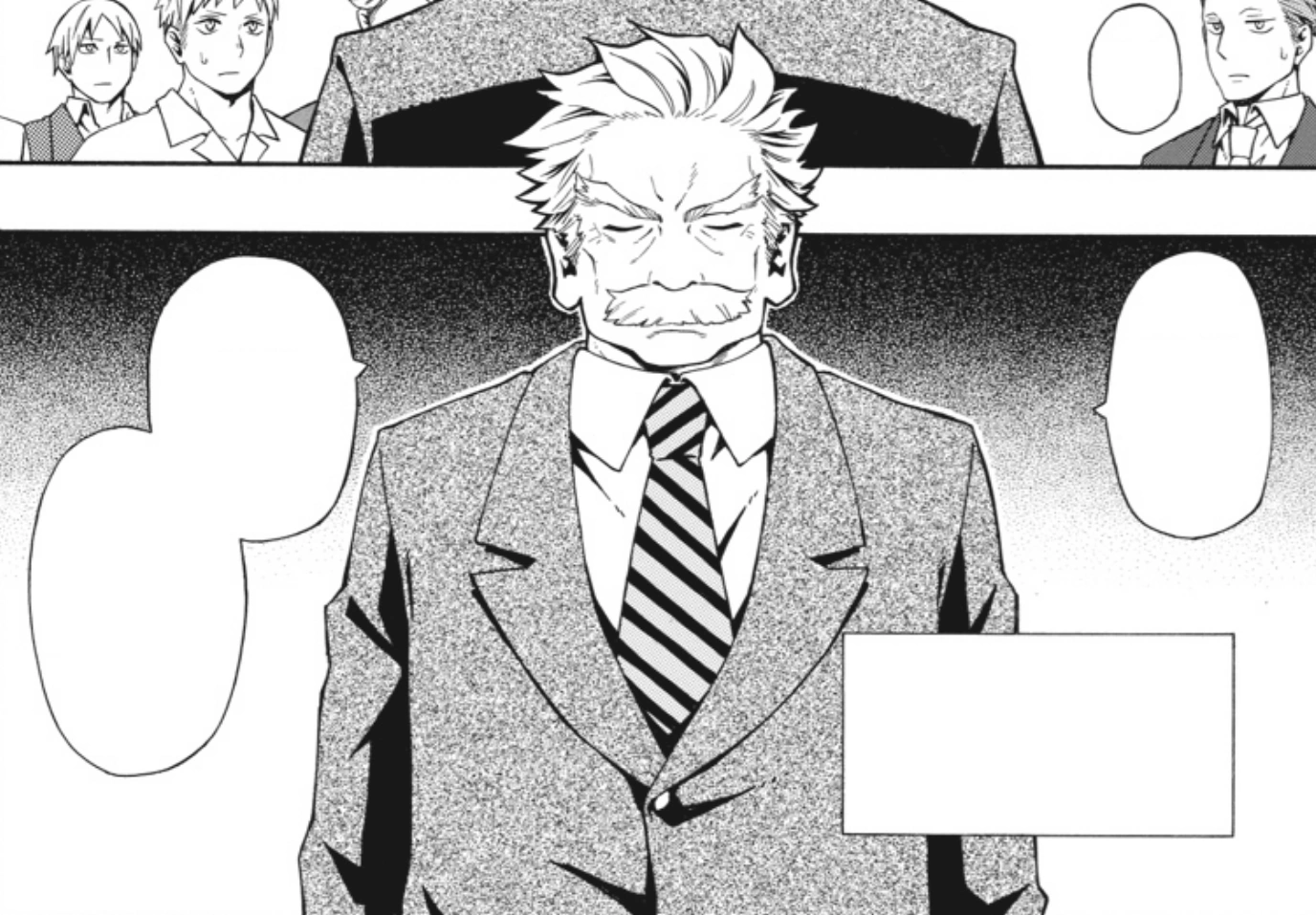 Meanwhile at the Alveare, the primo voto of the Martillo Family Kanshichirou Yaguruma is addressing a group of Martillo men (the rest having already gone to the festival). Ronnie asks him to take care of things at the Alveare, and Yaguruma turns to tell the men not to look so tense. After all, they're not at war, although the men might not get to enjoy the festival. At that moment, Firo bursts in, and Yaguruma informs the group that "a Gandor boss" got himself kidnapped. The other men start muttering amongst themselves at the news while Yaguruma continues on, explaining that they have no leads, and reminding them they ought to be careful: whomever the kidnapper was gave them no warning, no room for negotiations, and insolently went straight for the boss of all people. He compares the Martillo family to the Gandors—both small and in similar situations, but this time it was the Gandors who were targeted. He concludes his speech by asking that they stay on their guard.