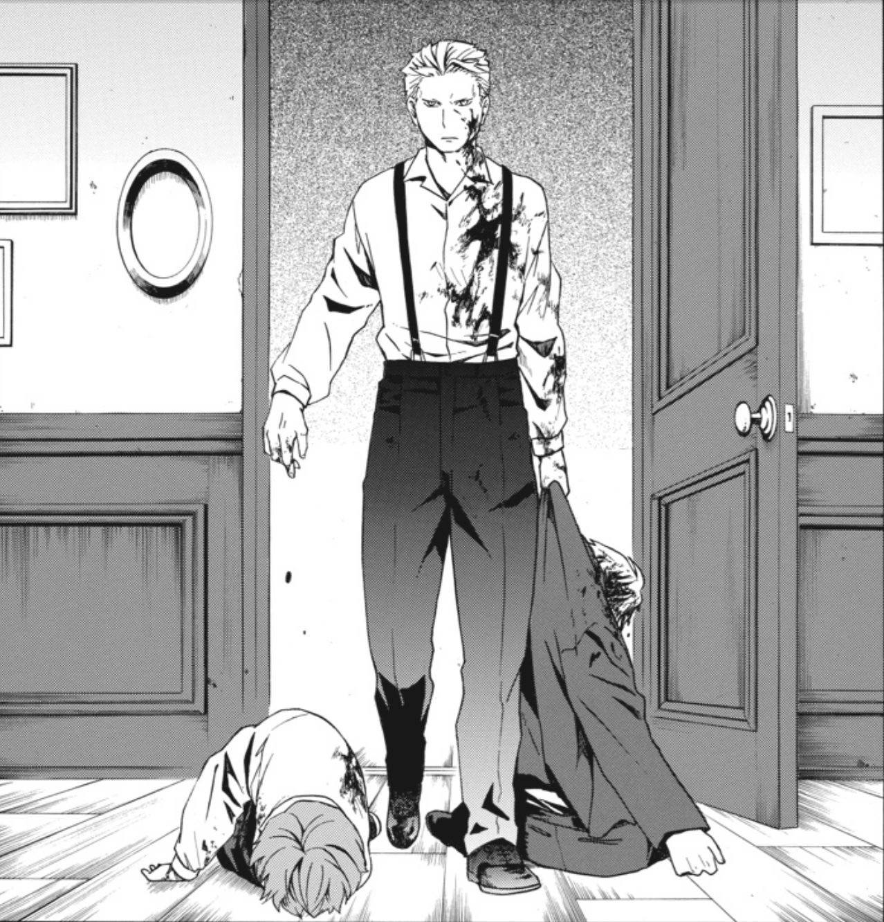 The manga cuts to Firo Prochainezo in the alleyway, having discovered a man strung up between two parallel walls and pierced by multiple stakes. He wonders if this is a warning from someone, and then takes off down the streets to report the body to the Martillos, not wanting to be spotted by the police.