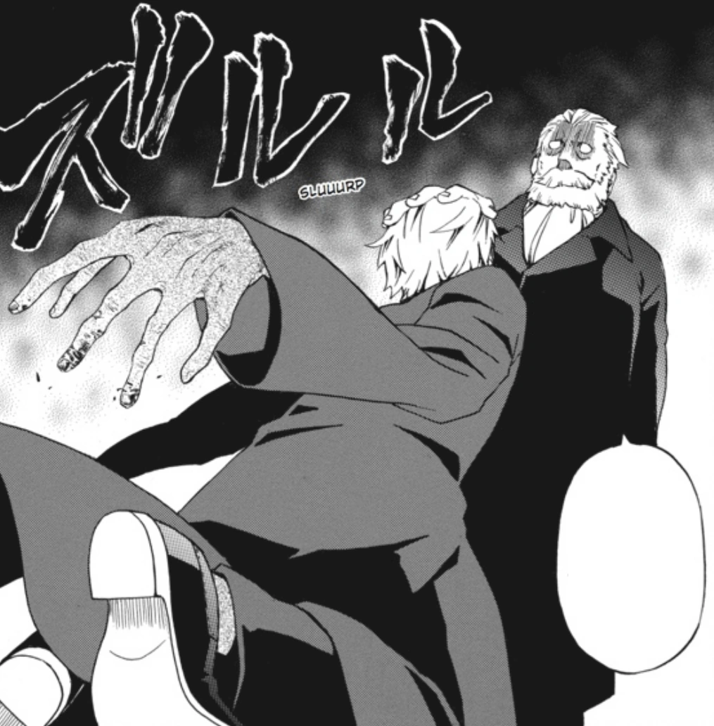 The smile slips from his face a moment later as he realizes something is wrong. In the next moment Szilard devours him, having no more need of Donatello. As Donatello's robe and shoes fall to the ground, Szilard hmphs. Just as he thought, "eating incompetents...adds nothing" to his knowledge.