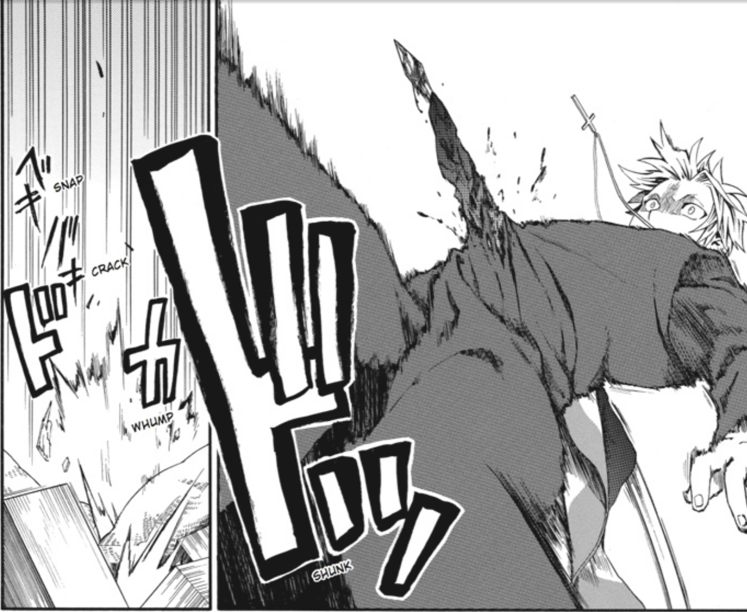 Claire blithely kicks the stake out of Donatello's hand and grabs it mid-air. With one motion, he drives the stake through Donatello's wrist. He notices something as he tugs on the stake, but he has no time to dwell on it while the priest leers down at him