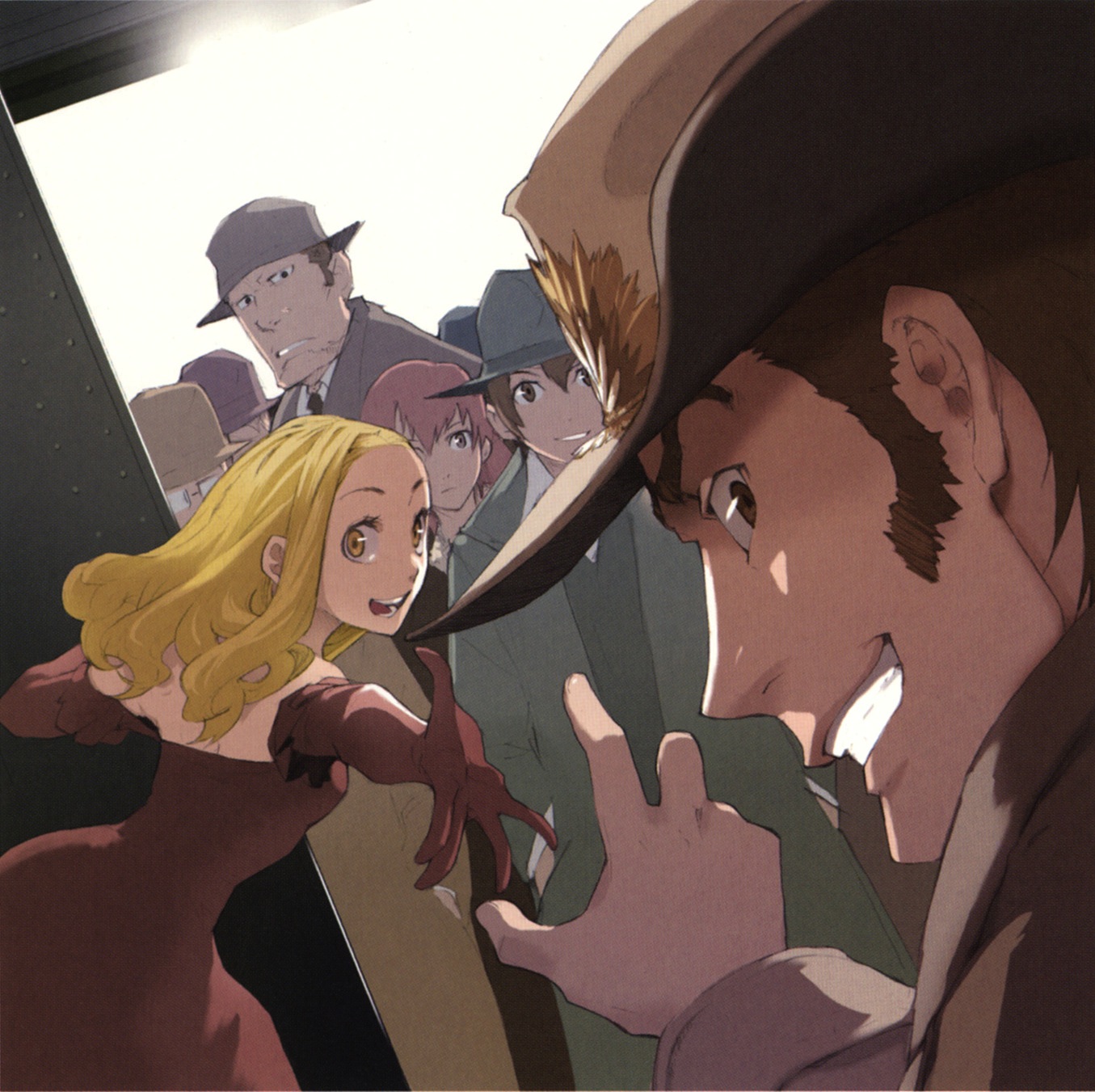 - Hidden Nameplate: To preserve one of the anime's main plot twists, Claire Stanfield appears in the opening only as the Young Conductor and is not given an official nameplate. Rachel, who serves as a red herring for Claire, is missing from the opening entirely. However, the champagne bottle can be taken as an unofficial nameplate for Vino, Claire's name as an assassin.