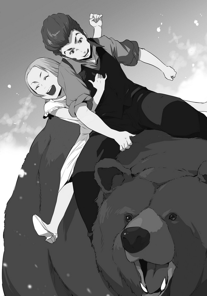 Firo warns them to stop antagonizing the bear, shoving Who (who has passed out once again) into the adjacent room, and the bear scoops Isaac and Miria up by the legs and tries to toss them onto its back. They hit his back only to roll off it, so the bear lowers itself as much as it can in a clear invitation for them to climb aboard. Isaac and Miria scramble onto the bear's back obligingly, and celebrate their achievement.