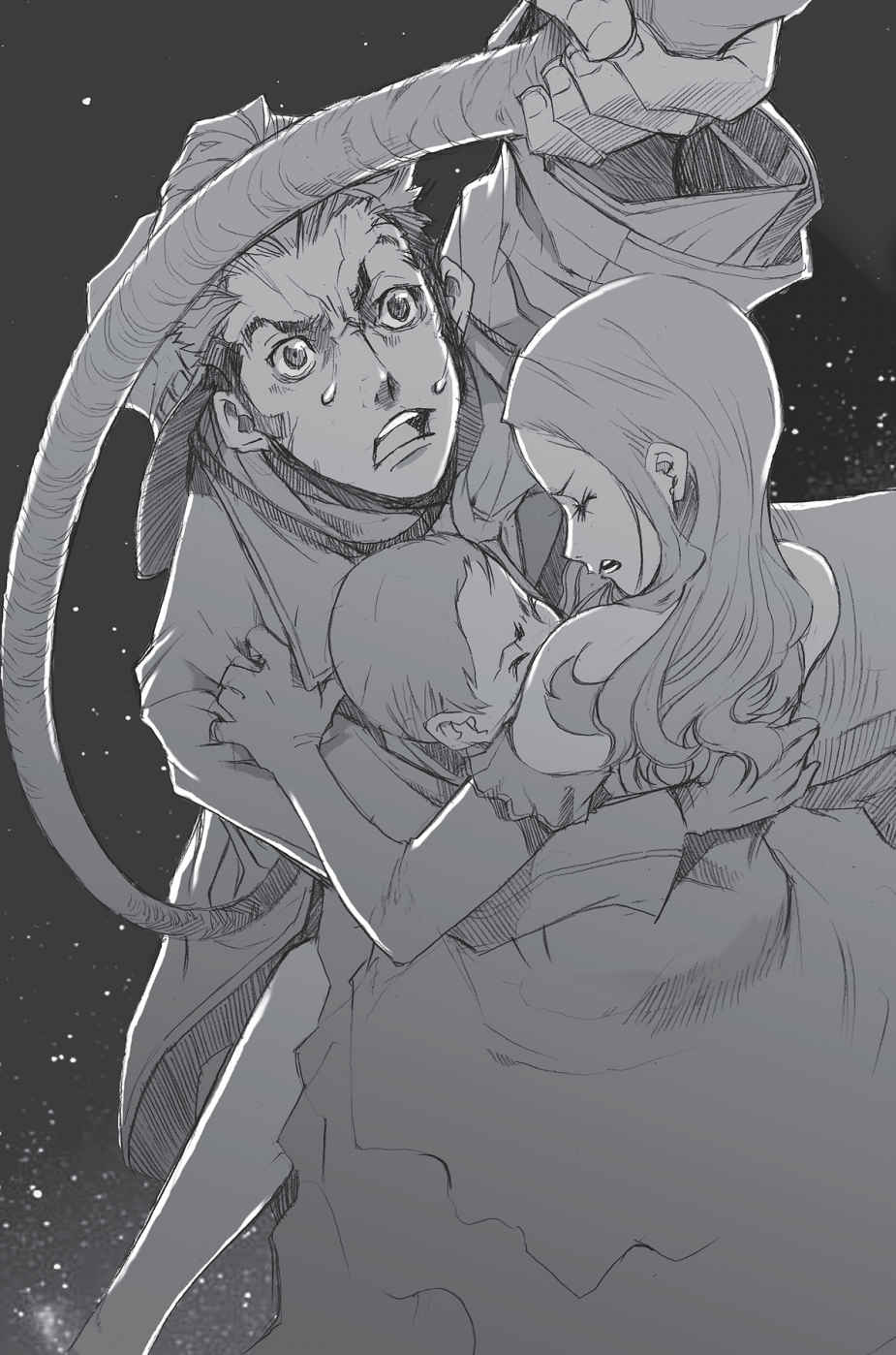 Miria grips Isaac's legs as he shimmies out the window, cutting his hand in the process. Unbeknownst to either of them, the Rail Tracer enters the cabin just as Miria shrieks Isaac's name. Isaac exits the cabin altogether, clinging to the side ornamentation upside-down to lessen Miria's burden, and shouts in relief when Czeslaw's eyes flutter open. He does not notice that his cut is bleeding onto Czes' face, or that the blood zips back into the wound.