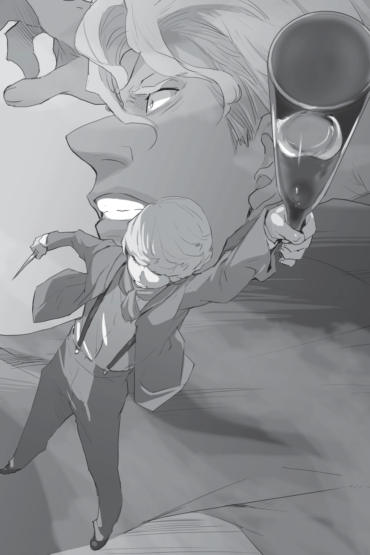 Lester internally crows in victory over his success, intending to shout the words out loud. Instead—air leaks from his throat, and he is unable to speak. As his sanity returns to him, he realizes that the searing agony across his body has not ceased. He screams. Though his neck is no longer bleeding, his wounds are not healing, and the blood that he has spilled has not returned to his body. As he thrashes on the floor in confusion, Elmer looks down at him and sighs that this is why he tried to stop him. The Grand Panacea does not heal one's previous injuries nor illnesses.